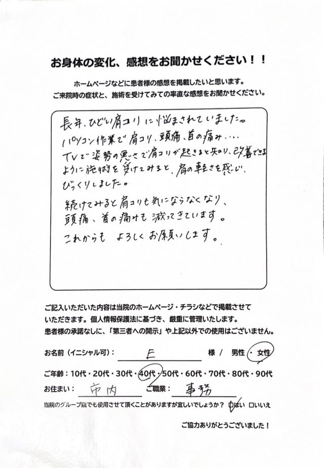 TVで姿勢の悪さで肩コリが起きると知り、改善できるように施術を受けてみると、肩の軽さを感じ、びっくりしました。